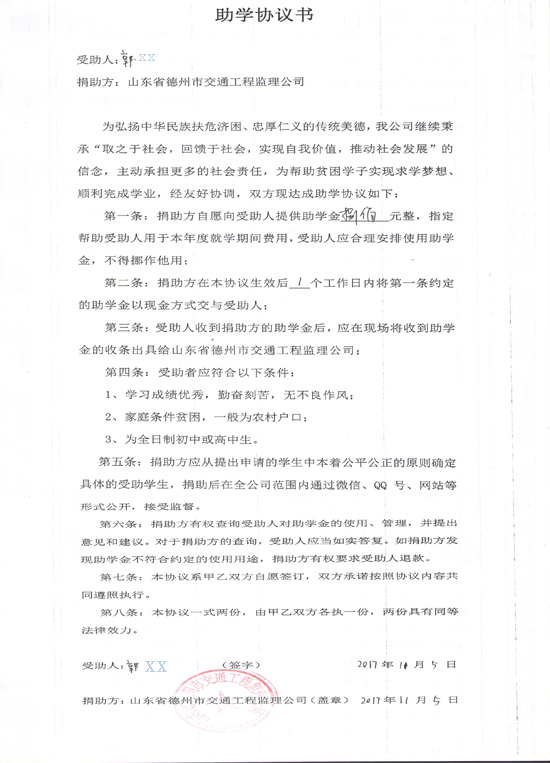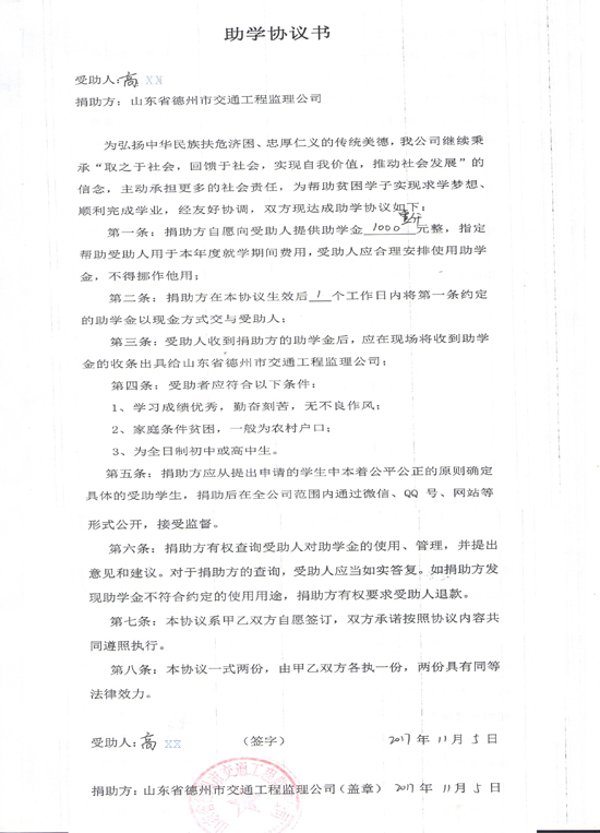 在此基礎(chǔ)上,我們認為公司還能做得更好更多,優(yōu)秀企業(yè)對社會的信譽不應(yīng)該停留在提供關(guān)注本身的層面上,而應(yīng)該通過承擔(dān)更多的社會責(zé)任、幫助需要的社會群體實現(xiàn)公司更大價值,也為員工自我價值的提升提供一個平臺。樂善好施、扶貧幫困是中華民族的傳統(tǒng)美德;相互幫助、患難扶持是社會倡導(dǎo)的時代新風(fēng)。它既體現(xiàn)了人類最高尚的品質(zhì)、最美好的情感和道德情操,又是社會文明與進步的標(biāo)志。帶著對這一份理解,監(jiān)理公司決定在全公司范圍內(nèi)發(fā)起倡議,用我們的愛心,竭盡全力圓新生力量的“讀書夢”。我們將為條件家庭困難的莘莘學(xué)子提供讀書條件,幫助他們順利完成學(xué)業(yè)。
